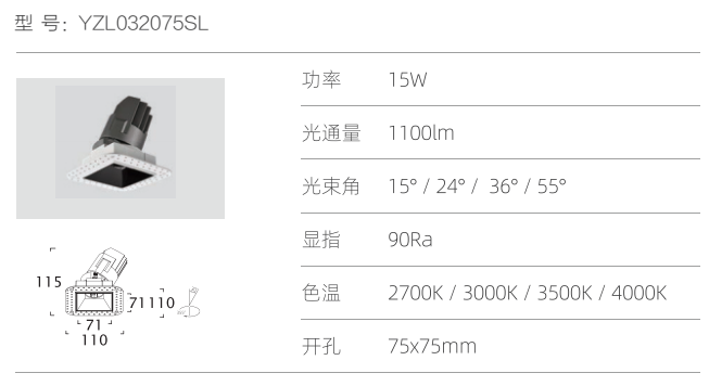 功率:15W 光通量:1100lm 光束角:15°/24°/36°/55° 显指:90Ra 色温:2700K/3000K/3500K/4000K 开孔:75x75 mm